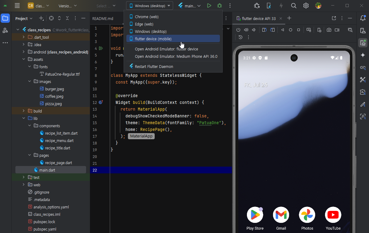 | 플러터) 레시피 앱 만들기 2. 메인페이지 코드구현 (2) | 2025.07.25 |