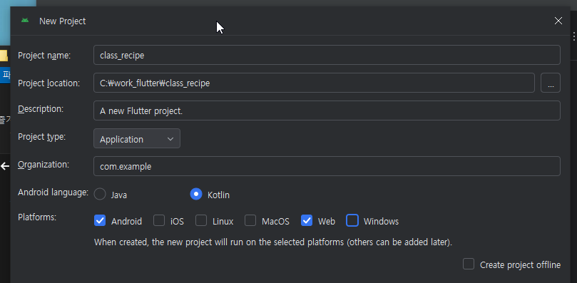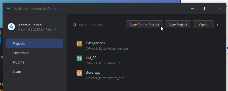 1.안드로이드 스튜디오를 열어 기존프로젝트를 끄고 플러터 프로젝트를 만들어준다.