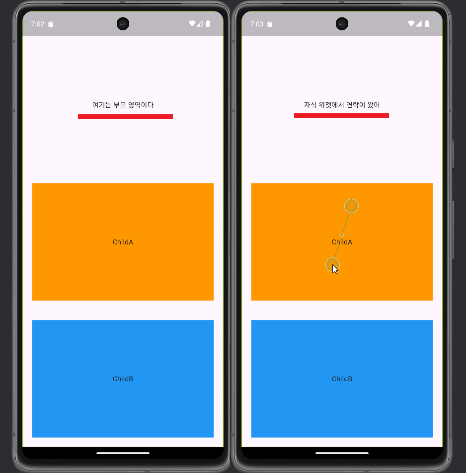 자식 위젯들은 사용자의 탭 이벤트를 감지해 전달받은 handleReciever 함수를 호출, ParentView의 텍스트를 변경하고 화면을 업데이트하게 된다.