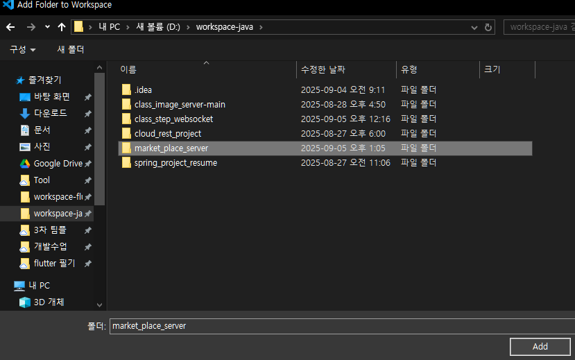 ② 두 번째 프로젝트 폴더(예: markit_place_front)를 선택하여 작업 영역에 추가함.