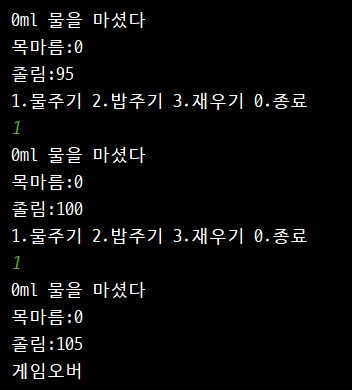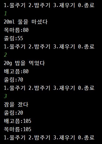 System.out.println("1.물주기 2.밥주기 3.재우기 0.종료");
