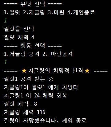 System.out.println("저글링이 사망했습니다. 게임 종료");