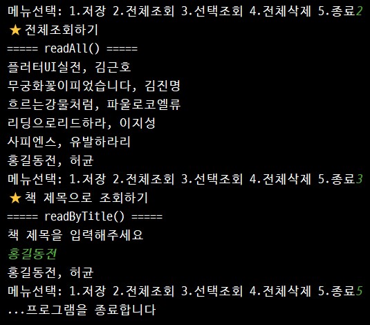 System.out.print("메뉴선택: 1.저장 2.전체조회 3.선택조회 4.전체삭제 5.종료");