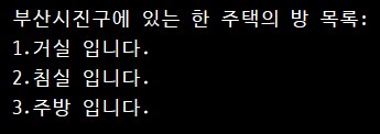 System.out.println(address+ "에 있는 한 주택의 방 목록: " );