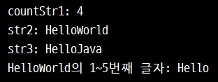 System.out.println("HelloWorld의 1~5번째 글자: " + result1);