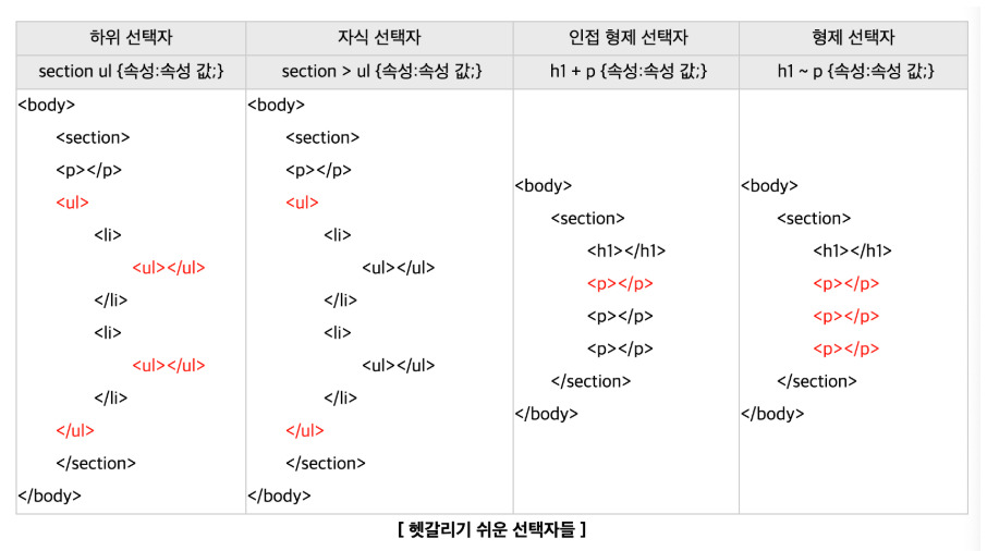 두개 이상의 선택자를 기호로 연결해 사용한다.